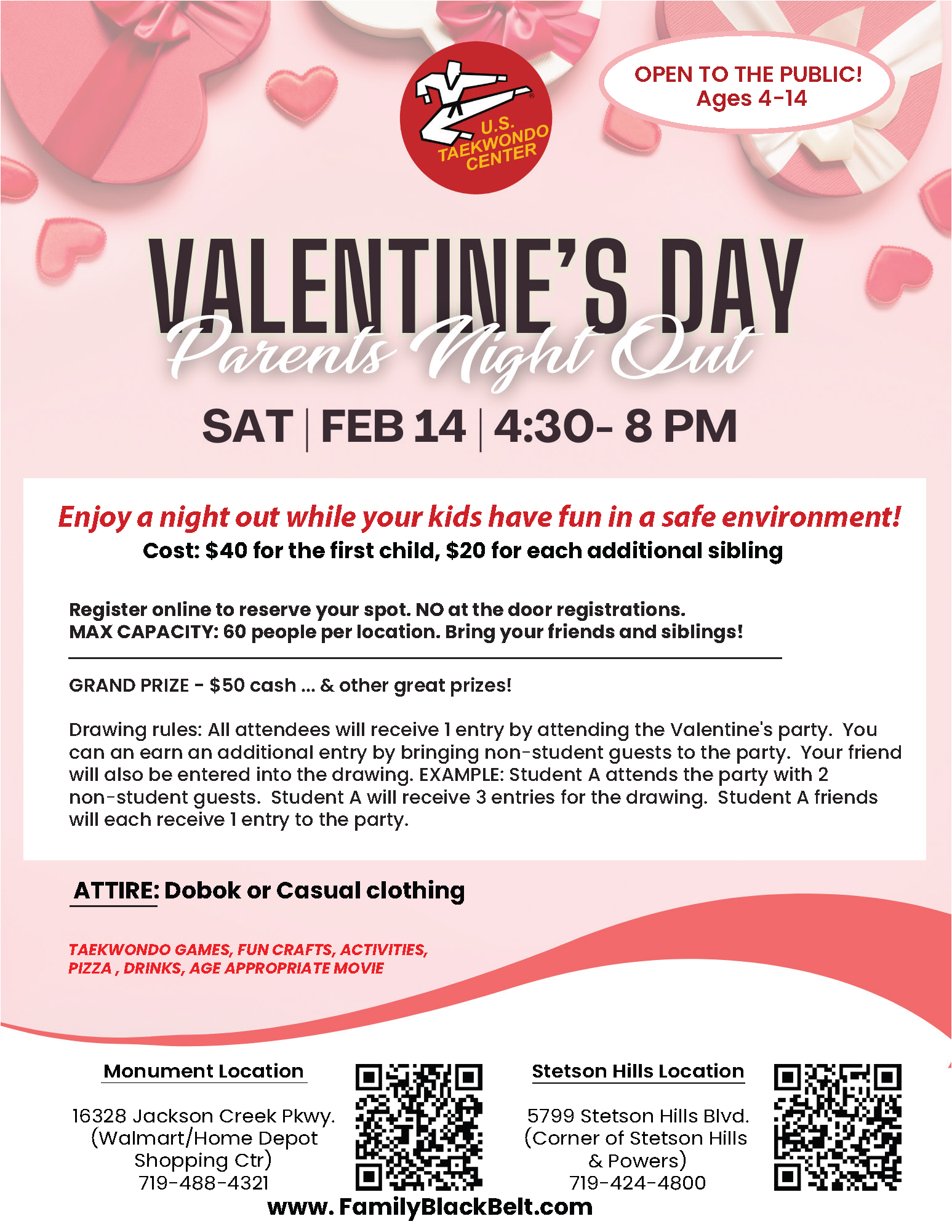 Reserve your spot NOW for our Valentine’s Parents Night Out on Saturday, Feb. 14th from 4:30pm – 8:00pm. Bring your kids to either of our U.S. Taekwondo Center locations for a fun night of Taekwondo, games, crafts, and pizza while you enjoy a kid-free evening. Click on the location you would like your child to attend. See the flyer below for details.